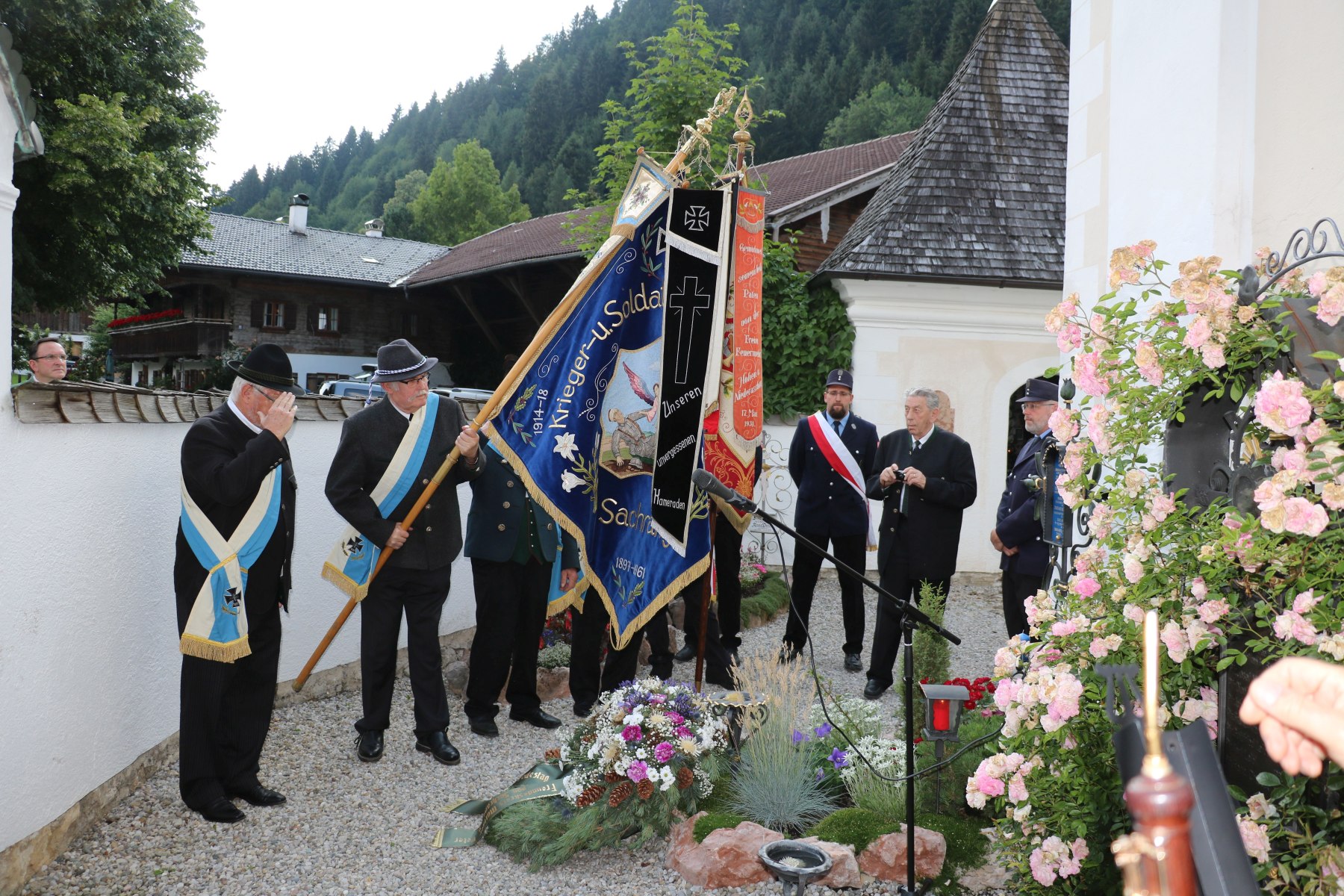 Die Sachranger Fahnenabordnungen beim Totengedenken zum 175. Todestag von Peter Huber, des Müllner Peter von Sachrang am Grabe.