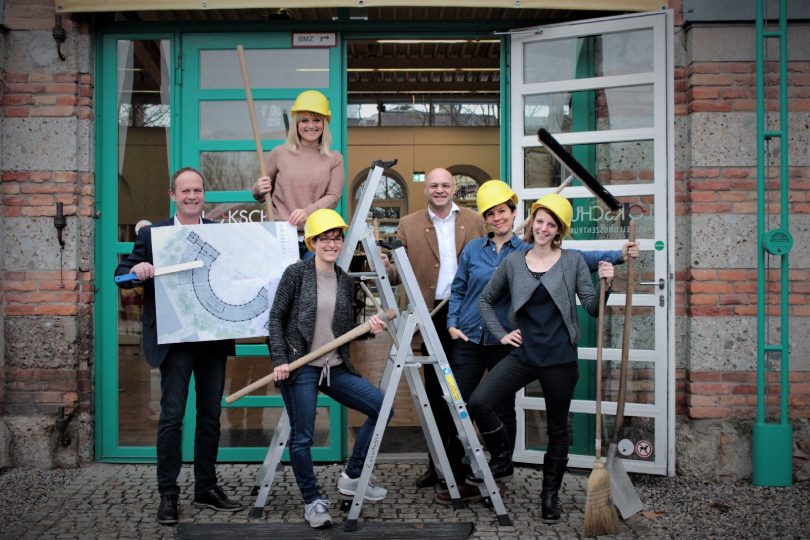 • Von links: Der Leiter des Ausstellungszentrums Lokschuppen Dr. Peter Miesbeck, Stefanie Kießlijng, VKR-Geschäftsführer Peter Lutz, Laura Thiemann, Barbara Huber. Auf der Leiter: Elena Sangl.
