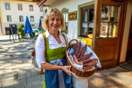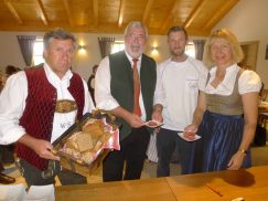 RegRo-Vorsitzender Sebastian Friesinger freute sich bei der Höslwanger Zusammenkunft über den Besuch von vielen Mitstreitern aus Politik und Wirtschaft, so galt sein besonderer Gruß unter anderem einigen Bürgermeistern der Landkreis-Gemeinden, stellvertretend namentlich Hans Murner aus Höselwang und den Bürgermeistern Stefan Schlier von der Stadt Bad Aibling sowie 2. Bürgermeister Daniel Artmann aus Rosenheim, Wolfgang Hampel als Leiter des Amtes für Landwirtschaft in Rosenheim, Geschäftsführerin Christine Pfaffinger vom Tourismusverband Chiemsee-Alpenland sowie als Vertreter des Bayerischen Bauernverbandes Kreisbäuerin Kathi Kern, Sepp Bodmaier und Klaus Gschwendtner. Annemarie Biechl, Ehren-Landesbäuerin und Schirmherrin des Bauernherbstes seit der ersten Stunde würdige in ihrem Grußwort dass Engagement zugunsten des Bauernherbstes mit den Worten: „In diesen schwierigen Zeiten ist es notwendig, mit Herzblut dabei zu sein und das ist beim Verein RegRo und seinem Vorsitzenden der Fall“. Bürgermeister Hans Murner von der gastgebenden Gemeinde Höslwang sagte seinerseits in seinem Grußwort: „In schwierigen Zeiten ist es umso wichtiger auf regionale Erzeugnisse das Augenmerk zu richten, manchmal verstehe ich nicht, dass sogar Bio-Produkte zum Teil von weit her auf unsere Märkte gebracht werden, wenn wir selbst diese Produkte vor Ort haben“. Zwei solcher Produkte, die in unmittelbaren Zusammenhang mit den heurigen Bauernherbst-Angeboten stehen, sind traditionell die Bauernherbst-Wurst und das Bauernherbst-Brot. Theresa Albrecht als Vertreterin des Hotel- und Gaststättenverbandes und der Metzger-Innung stellte aus der Metzgerei Stocker eine roh-geräucherte Salami mit wenig Fett-Anteil und damit als bestens geeignete Brotzeit für Wanderer vor. Hubert Steffl, Ehren-Obermeister der Rosenheimer Bäckerinnung freute sich, dass er mit dem langjährigen Lehrlingswart der Innung, Sepp Messerer das Bauernherbst-Wallnuss-Brot vorstellen konnte. Dieses Brot – so die Bäcker-Vertreter – bleibt aufgrund der Nüsse lange saftig und frisch und ist auch für die Gehirnleistung besonders gut.
