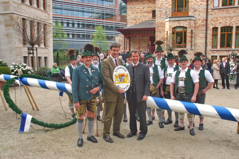 Bericht: Bayerische Staatskanzlei – Archiv-Foto: Hötzelsperger (Maibaumaufstellen mit Trachtlern aus Prien-Atzing mit damaligem Europaminister Dr. Markus Söder im Jahr 2008).