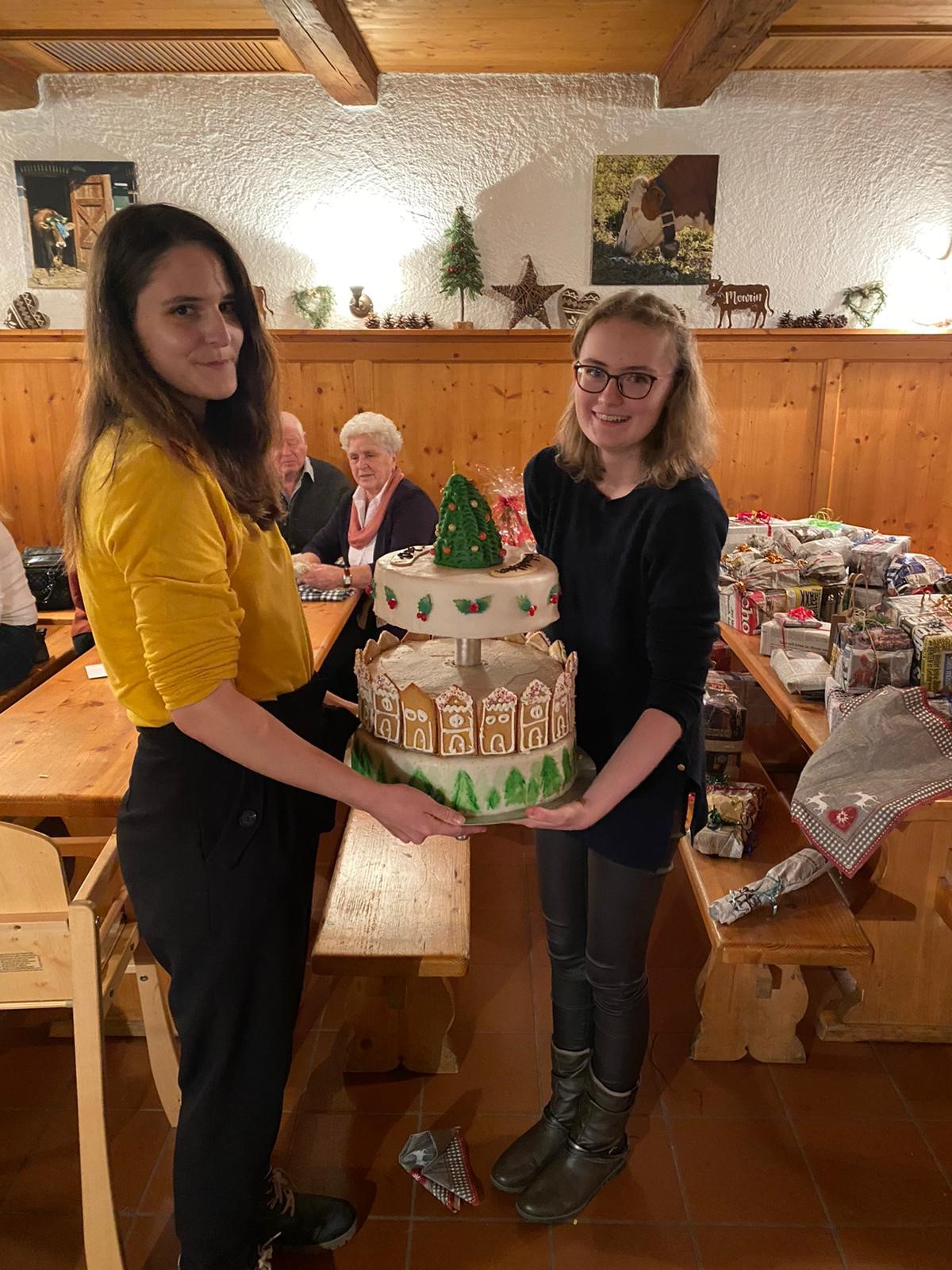 Die Azubis der Konditorei sorgten für die Nachspeise. Das Bild zeigt Sylvia und Elisabeth mit einer Weihnachtlichen Torte.