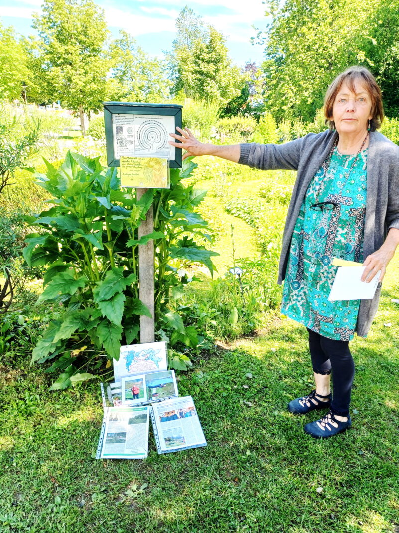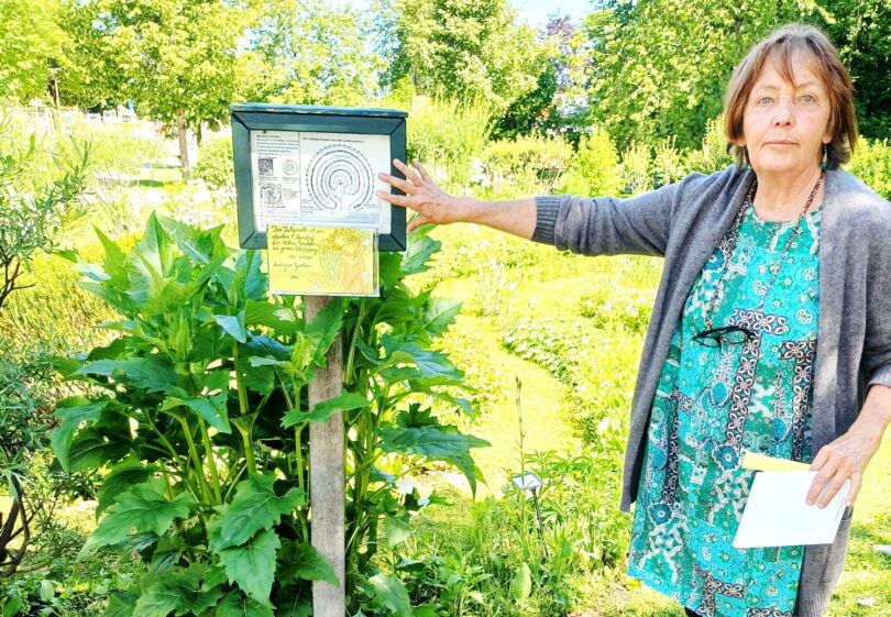 Bericht und Foto: Christiane Giesen Friederike Brandl, die von Anfang mit dabei war und das Labyrinth in Marquartstein immer mit betreut, erklärt Besuchern seine Bedeutung.