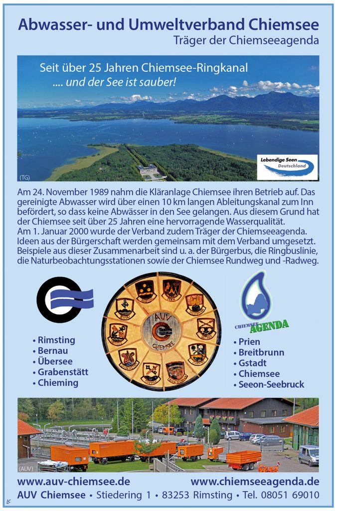 Begonnen hat alles schon 1978. Damals ergriffen Bernau, Breitbrunn, Chieming, Grabenstätt, Chiemsee, Gstadt, Prien, Rimsting, Seeon-Seebruck und Übersee die Initiative und gründeten den Abwasserzweckverband mit Sitz in Rimsting. Ziel war, mit der Errichtung einer Ringkanalisation und einer Gemeinschaftskläranlage, die Reinhaltung des Chiemsees. Dieses „Jahrhundertbauwerk“ war nicht von heute auf morgen verwirklicht. Mit Standortsuche, Planung und Bau des Ringkanals samt Kläranlage in Stiedering wurde es 1989, bis das Projekt verwirklicht wurde. Schon bald wurde klar, dass die Reinhaltung des Chiemsees nicht genügte, um die einzigartige Umwelt in richtigem Maße zu erhalten und nachhaltig zu fördern. „Nach einigen Jahren des Verhandelns und des Auslotens von Interessen konnten die Gemeinden sich einigen und beschlossen im Jahr 2000 den Aufgabenbereich des Abwasserzweckverbands durch Satzungsänderung auf Umweltfragen zu erweitern, beschreibt Thomas Weimann, AUV-Geschäftsführer, den Entstehungsprozess.