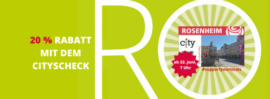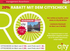 Das City-Management Rosenheim möchte einen Beitrag zur Unterstützung der Rosenheimer Betriebe leisten und das Einkaufen in Rosenheim noch attraktiver machen. Deshalb werden ab dem 22. Juni cityschecks in limitierter Stückzahl im Gesamtwert von EUR 50.000 mit einem Rabatt von 20% verkauft. Das bedeutet 20% sparen beim nächsten Einkauf in einer der vielen Annahmestellen. Der Rabatt in Höhe von EUR 10.000 wird vom City-Management getragen, um so den heimischen Betrieben zu helfen.