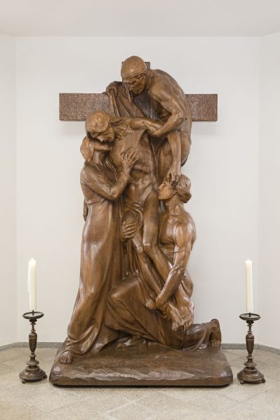 Ein Teil des ehemaligen Kriegeraltars die „Herablegung“, geschaffen von Angelo Negretti für die Gefallenen des ersten Weltkrieges und gestiftet vom Seidenfabrikanten Konsul Kotzenberg an den Veteranen- und Kriegerverein Aschau im Jahr 1922, fand seine neue Heimat in der Aussegnungshalle am Aschauer Friedhof.