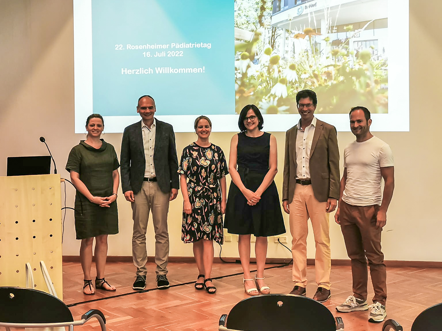 Die Oberärzte des RoMed Klinikums Rosenheim Thekla Getzinger und Andreas Greiner (v. l.) sowie Oberarzt Arni Kirchner und Leitender Oberarzt Dr. Micheal Buss (v. r.) mit den Referentinnen des Dr. von Haunerschen Kinderspitals Oberärztin Dr. Lucia Gerstl (3. v. l.) und Prof. Dr. Esther Maier (3. v. r.).