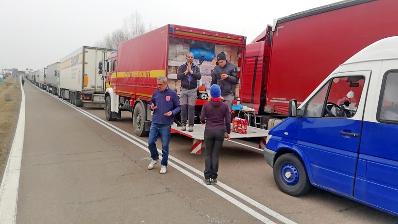 Traudi Steiner vom Helferkreis kümmerte sich um die Zollformalitäten und zusammen mit ihrem Mann Jakob sowie den Mitarbeitern der FFW Prien konnte die Beladung der Fahrzeuge ordnungsgemäß über die Bühne gehen. Wöchentlich gingen nun Transporte an die Grenze. Ob die Feuerwehr Prien mit drei Fahrzeugen oder wieder der LKW der Fa. Tonwerk sowie die Begleitfahrzeuge mit all ihren Fahrern – alles funktionierte einwandfrei und alle machten sich mit Eifer, aber auch mit großer Verantwortung ans Werk. Denn alle wussten: wir fahren in ein Kriegsgebiet, zwar nicht sehr weit, aber über die Grenze mussten alle, da die ukrainischen Männer im Alter von 18 bis 60 Jahre das Land nicht verlassen durften. Inzwischen konnten 9 Lieferungen an der Grenze übergeben werden.