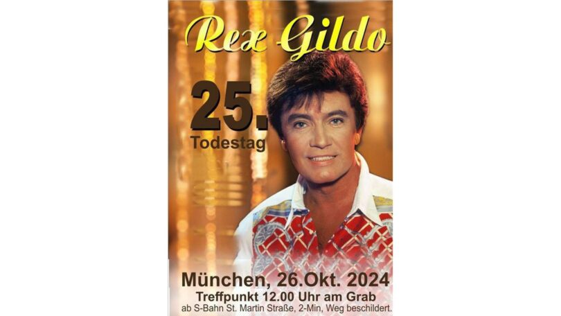Am 26. Oktober 2024 findet in München anlässlich des 25. Todestages von Rex Gildo eine Gedenkveranstaltung statt. Der Treffpunkt ist um 12:00 Uhr am Grab des Sängers auf dem Ostfriedhof, nahe der S-Bahn-Station St. Martin Straße.