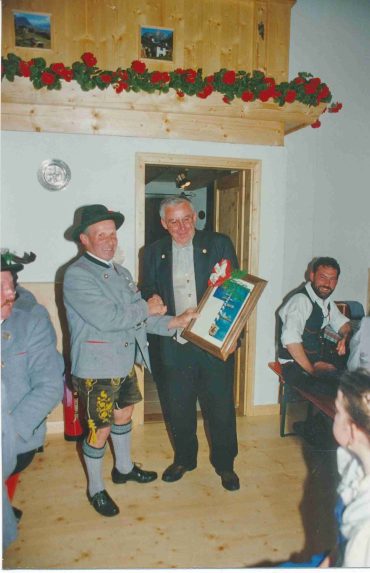 Fotos: 1. v.l. Kassier Andreas Leitner,Schriftführer Gerhard Hefter, stellver.Vorstand Georg Gar jun, Fähnrich Andi Pichler,Vorstnd Peter Bichler – 2. Wofgang Sattelberger, ehem.Festleiter Gaufest Neubeuern mit den Marketenderinnen des Patenvereins, mit dem gespendeten Schnapsbanzerl- ein Probetrunk für alle Versammlungsgäste folgte noch im Saal – 3. Weitere Eindrücke und Erinnerungen.