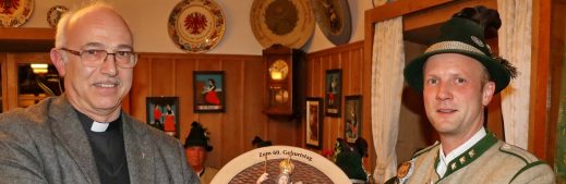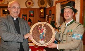 Bericht und Foto: Heinrich Rehberg – Eine reich geschnitzte Schützenscheibe anlässlich seines 60. Geburtstags überreichte Kompaniepfarrer Hermann Overmeyer bei der Jahreshauptversammlung der Königlich bayerischen Gebirgsschützenkompanie Aschau (GSK) im Gasthaus Brucker an Hauptmann Hubert Stein. Die Scheibe wird auch nach dem Ausschießen als besondere Zierde im Vereinslokal verbleiben.