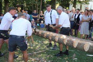 Die schwere Zimmererarbeit das “Balkenhaun aus einem Baumstamm wurde auf dem Hoffest gezeigt