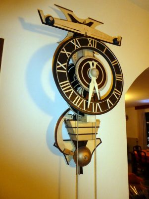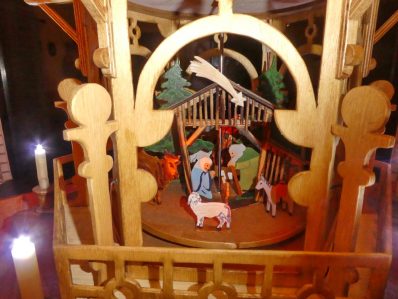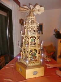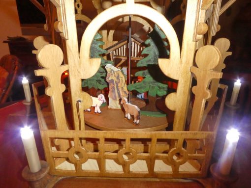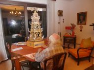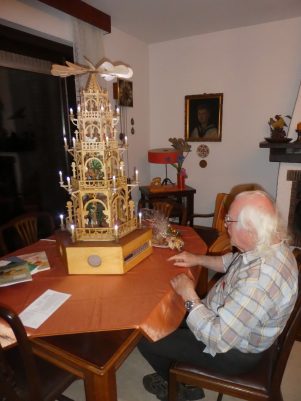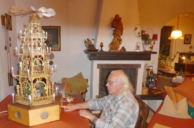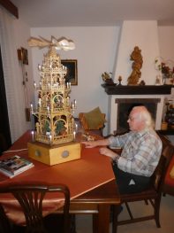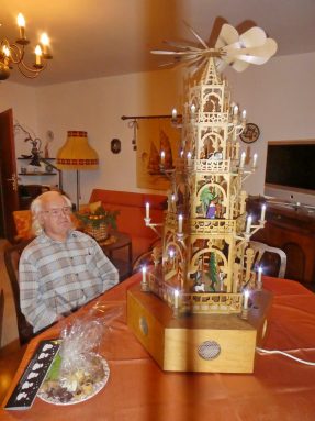 Ein besonderes Geschenk hat sich der Hobby-Uhren-Tüftler Friedrich Pfaff aus Prien a. Chiemsee selbst für das heurige Weihnachtsfest gemacht. Anstatt einem Christbaum gibt es heuer in der Wohnung eine aus dem Erzgebirge nachempfundene Weihnachgspyramide. Im Sommer begann Pfaff mit den filigranen Arbeiten und alles, was die fertige Pyramide zeigt, ist von ihm handgemacht: alle Teile wurden von ihm geschnitzt, die Figuren einschließlich der Weihnachtskrippe wurden auch von ihm bemalt. Original Wachskerzen hat Pfaff in der Pyramide durch versteckte Kabel mit kleinen LED-Lichtern ersetzt. Um dem Bauwerk einen Klang zu geben, wurden im Unterbau “Diese Pyramide verliert keine Nadeln und sie erfreut uns über die Weihnachtszeit das ganze Jahr über” – so Friedrich Pfaff, der schon viele individuelle Wünsche als Hobby-Bastler erfüllt hat. Die Anzahl der Stunden, die er für die Weihnachtspyramide seit dem Sommer aufgewendet hat, hat er nicht notiert. “Der Stundenlohn ist für mich nicht wichtig, was zählt sind die Freude und das Ergebnis” – gemäß diesem Motto widmet er sich bereits jetzt einem Neu- und Nachbau einer Wanduhr mit Flugzeug-Sperrholz. Uhren sind das Lebenselexier des Bastlers, der aus dem Schwarzwald stammt und im Chiemgau mit seiner Lebensgefährtin Edith Behlling eine neue Heimat gefunden hat. “Uhren rund um die Uhr und wohin man in seiner Wohnung auch schaut” – diesen Eindruck kann man bei einem Besuch in der Ernsdorfer Straße in Prien gewinnen – aber derzeit dominiert über alles die Weihnachtspyramide.