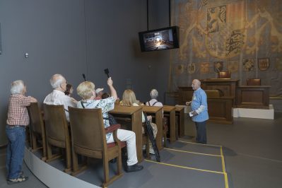 Auf Entdeckertour waren viele Besucherinnen und Besucher auch ein paar Meter weiter in der Dauerausstellung: so war heute der Plenarsaal des Landtags immer gut mit „Abgeordneten“ gefüllt und auch das Goggomobil war beständig auf seiner Reise in den 1950er-Jahren über den Brenner.