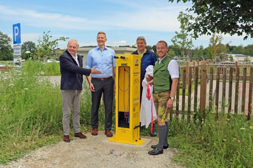 Simon Frank (Zweiter von links), Erster Bürgermeister von Aschau: „In Partnerschaft mit dem ADAC haben wir optimale Standorte für diese Fahrradservice-Stationen gefunden. Wir freuen uns darüber, dass wir mit diesem Angebot eine weitere Maßnahme zur Stärkung des Tourismus im Chiemgau und in Aschau umsetzen können. Wir bedanken uns sehr, dass wir als Teil des Projektes ausgewählt wurden.“