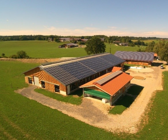 Viele landwirtschaftliche Betriebe im Landkreis Rosenheim nutzen ihre Dachflächen zur Erzeugung von elektrischer Energie mit Photovoltaik. Familie Posch aus Hochstätt in der Gemeinde Schechen hat auf ihren Gebäuden Module mit einer Leistung von insgesamt 440 kWp und eine Batterie zur Stromspeicherung installiert. Da der moderne Betrieb mit 70 Milchkühen und Jungvieh selbst viel Strom verbraucht, hat die Deckung des Eigenbedarfs Priorität. Der Bezug von Reststrom aus dem Netz soll möglichst niedrig gehalten werden. Im Versuchsbetrieb unter wissenschaftlicher Begleitung konnte nach mehrjährigen Messungen die Eigenversorgungsquote zum Betrieb von Melkroboter, Stalllüfter, Heißwasser zur Reinigung des Melkroboters, Eiswasser zur Milchkühlung und für den elektrischen Futtermischwagen optimiert werden. Die bei der Kühlung der Milch gewonnene Abwärme wird zum Vorwärmen des Heißwassers genutzt. Der nicht selbst benötigte Solarstrom wird ins Netz eingespeist.