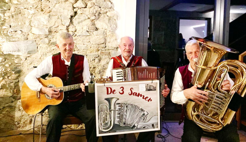 Seitdem singen und spielen De 3 Samer mit ihren Instrumenten auf diversen Veranstaltungen wie z.B. Geburtstagsfeiern, Firmenfeiern, Hochzeiten und überall wo zünftige und gemütliche alpenländische Musik gefragt ist – so auch am Sonntag, den 1. September von 10 Uhr bis 12 Uhr im Bad Aiblinger Kurpark. Besetzt ist die Gruppe mit Akkordeon, Gitarre und Tuba bzw. Kontrabass.
