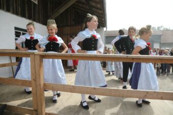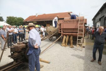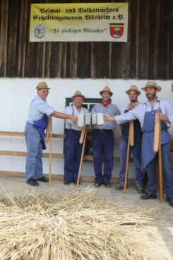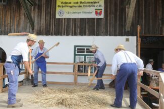 An diesem Sonntag hatten die Besucher die Möglichkeit, sich über Arbeitsgänge und Funktionsabläufe der Erntezeit von anno dazumal zu informieren oder Erinnerungen aus Großvaters Zeiten zu wecken. Hauptattraktion der mehrstündigen Veranstaltung war die Vorführung des Dreschens mit dem Dreschwagen und das Drischldreschen mit den Dreschflegeln. Die Organisatoren drehten dabei das Rad der Zeit zurück, um den Besuchern einen Einblick in die Landwirtschaft und altes Handwerk der sogenannten “guaden oiden Zeit” zu gewähren. Zwischendurch führte der Trachtlernachwuchs verschiedene eigens einstudierte Volkstänze auf, wozu sie viel Beifall und Applaus ernteten.