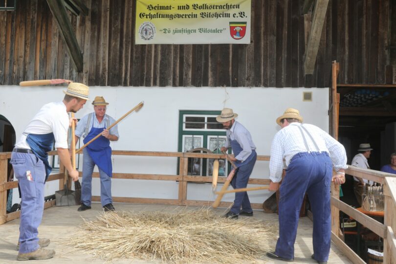 Für das leibliche Wohl der Gäste sorgten die Trachtlerfrauen mit Küchln, frischem “Schmalzgebackenen”, frischer selbstgemachter Butter sowie mit altbayerischen Drescherbrotzeiten, “Sau vom Grill”, Steckerlfisch und dem süffigen Arntbier. So konnten die Zuschauer und Gäste Jung und Alt aus Stadt und Land in Vilsheim am Sonntag in einer Art lebendigen “Freilichtmuseum” Einblick verschaffen, wie mühsam und schweißtreibend die Arbeit auf dem Land am Hof und auf dem Feld war. Hierzu hat die ganze Vilsheimer Trachtlermannschaft unter der Leitung des ersten Vorsitzenden Hans Voitenleitner ganze Arbeit geleistet.