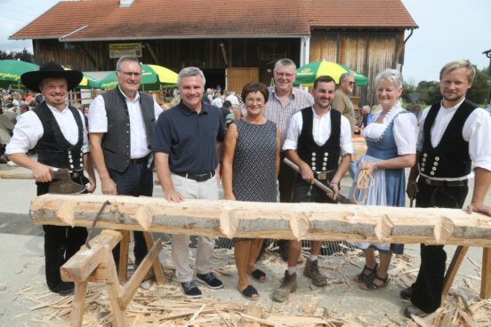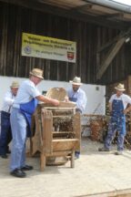 Zu sehen gab es hierbei eine ganze Menge: Das Drischldreschen, das nur noch wenigen bekannt ist, wurde von vier jungen Männern unter der Anleitung von Michael Brandlmeier vorgeführt. Obwohl das Drischldreschen leicht aussieht, ist es eine schweißtreibende Arbeit, bei der viel Konzentration und ein gutes Taktgefühl erforderlich ist. Die vorgestellte Putz- beziehungs-weise Windmühle diente zur Getreidereinigung nach dem Dreschen. Sehr gut kamen bei den Besuchern die alten Handwerksarbeiten an, die von den Vereinsmitgliedern vorgeführt wurden. Das Seil- und Strickmacherhandwerk führten die Kapfinger Paul Selmansberger und Kastulus Wimmer zusammen mit ihren Ehefrauen bereits seit Anfang vor, also seit 30 Jahren. Auch selbstgebrannte sowie Staatspreisprämierte Obstbrände sowie Liköre standen zur Probe bereit. Die Kunst des Balkenhauens aus einem Baumstamm führten die drei Zimmerer Michael Brandlmeier junior, Stephan Peißinger und Sebastian Spierer den interessierten Besuchern vor. Die Oldtimerfreunde aus dem benachbarten oberbayerischen Kirchberg/Schröding sowie die Standmotoren- und Bulldogfreunde aus Moosburg und die Bulldogfreunde “Ois oid” aus Langenvils kamen mit restaurierten alten Bulldogs, Zweikrafträdern, Standmotoren sowie mit Traktoren-Veteranen in das Vilstal.