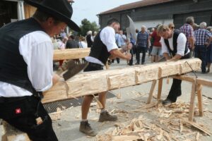 Die drei Zimmerer Michael Brandlmeier junior, Stephan Peißinger und Sebastian Spierer führten die Kunst des Balkenhauens aus einem Baumstamm vor