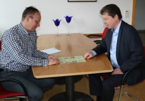 Die Frasdorfer Bürgerstiftung gewährte dem Ökumenischen Sozialdienstes Priental (ÖSP) einen Zuschuss von 3000 Euro. Der Vorsitzende des Ökumenischen Sozialdienstes Priental (ÖSP) Elmar Stegmeier (rechts) kam ins Frasdorfer Rathaus, um sich bei Bürgermeister Daniel Mair (links) diesen Zuschuss für den Betrieb der Seniorentagsstätte (Seta) Priental abzuholen.