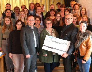 Uwe Merklein (zweiter von rechts) und Nicole Braeunig (rechts) erhielten 500 Euro für die „Priener Tafel“, Bürgermeister Daniel Mair 500 Euro (dritter von links) für die Frasdorfer Bürgerstiftung und Thomas Hoesch vom BRK (nicht im Bild) 500 Euro für das neue Fahrzeug des „Helfers vor Ort“. Der Betrag stammt aus dem Erlös des letzten Frasdorfer Gwandmarktes vor fast vier Jahren. Zwei Dutzend Frauen aus Frasdorf und Umgebung organisieren jedes Jahr einen Tauschmarkt für gebrauchte Trachtenkleidung.