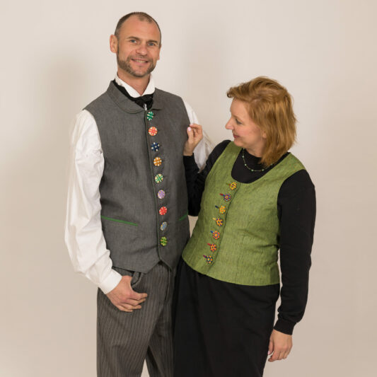 – Das Ehepaar Zimmer führt Leibchen und Leible mit zauberhaft klassischen Leinenstoffen vor, wobei die Knöpfe und bunten Knopflöcher ein echter Hingucker sind.