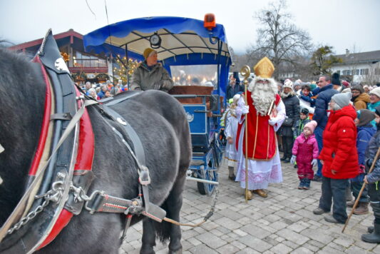 Der Nikolaus kam mit der Pferdekutsche  – Alle Kinder fieberten einem besonderen Ereignis entgegen, sie warteten auf den Einzug des Heiligen Nikolaus. Standesgemäß kam er mit einer Kutsche, die von den beiden beeindruckenden Rappen Hias und Traudi gezogen wurden. Mitten auf dem Markt vor dem beleuchteten Christbaum stoppte Sabine Lehrberger die Kutsche und der Heilige Nikolaus konnte mit seinen beiden Engeln aussteigen. Dicht gedrängt standen die Kinder, um Eines der kleinen Geschenke vom Nikolaus zu  bekommen.