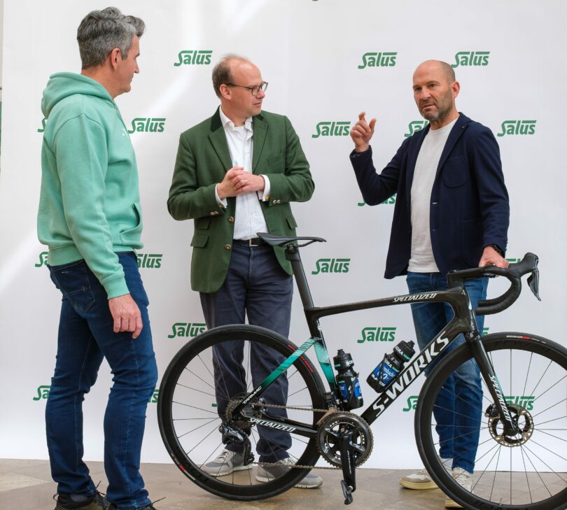 Bericht und Bilder: Firma Salus – Salus Geschäftsführer Dr. Florian Block (Mitte) hat das Rennrad fest im Griff. 1. Vorstand des RSV Götting Robert Heinzler (links) und 2. Vorstand Markus Ott freuen sich über die Unterstützung für die „Salus Radsportnacht“.