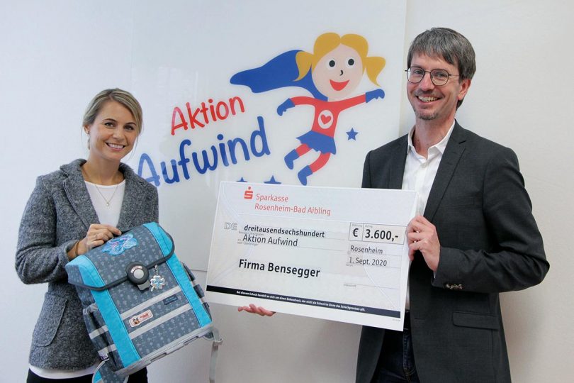 Mit einer Spende in Höhe von 3600 Euro hat die Firma Bensegger in diesem Schuljahr die „Schulranzenaktion“ der Aktion Aufwind unterstützt. Das soziale Hilfsprojekt der Sparkassenstiftungen Zukunft in Kooperation mit der Diakonie Rosenheim und der Arbeitsgemeinschaft Freie Wohlfahrtspflege setzt sich für Chancengleichheit von Kindern und Jugendlichen in der Region ein.