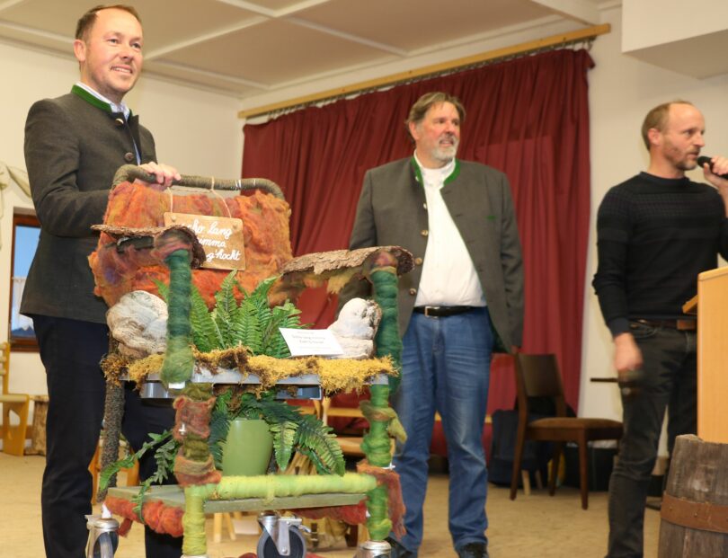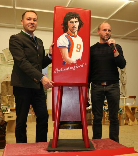 Versteigerer Schauspieler Florian Brückner und der Aschauer Tourismuschef Herbert Reiter mit dem „Denkmal an Gerd“ Hocker