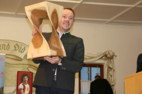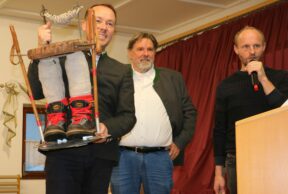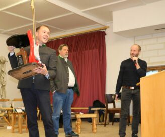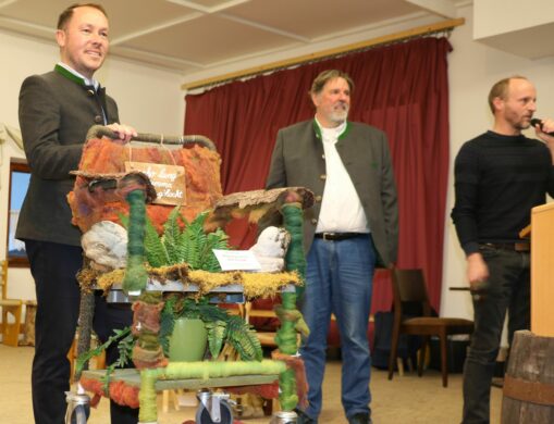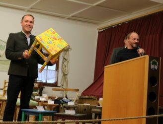 „Aschau bewies mit dieser Aktion wieder einmal, dass eine solche Gemeinschaftsaktion großen Zuspruch finden kann, eine Aktion bei der sich jeder einbringen und wiederfinden kann, egal ob als Privatperson oder in einer Gruppe – jeder packte mit an. Es war ein großer Zuspruch bei der es einen regelrecht vom Hocker haut“, eröffnete Tourismuschef Herbert Reiter die Versteigerung im voll besetzten Chaletsaal. Neben den stolzen Hockererbauern fanden auch alle drei Bürgermeister Frank, Andrelang und Schmid an diesem trüben Nachmittag den Weg ins Chalet, dazu auch Tatortkommissar Richy Müller und viele, die sich das ganze einfach nur einmal ansehen wollten. „Ein Hocker findet oft aufs Erste nicht die Beachtung, die im eigentlich zustünde, doch ein Hocker hat im Alltag eines jeden eine zentrale Position. Ob als schnöder Notsitz oder als Lieblingssitzgelegenheit oder zum Draufsteigen, wenn es pressiert oder was zum Draufstellen bis hin zum zentralen Blickfang für Deko aller Art – so ein Hocker hat vielfältige Bestimmungen und Aufgaben“, übergab Herbert Reiter an den Auktionator Florian Brückner als sachverständigen Schreinermeister. Als der Neffe des alten Meister Eder hat er in der Neufassung der Pumuckl Filme genügend Erfahrungen im Schreinerhandwerk gesammelt. Miteinander ging es dann weiter. Reiter suchte die Objekte aus und Brückner brachte sie an den Mann und an die Frau. Aufmerksam beobachtete er das Publikum im Saal, damit ihm ja kein Handzeichen und kein Gebot entgehe. Als erste gingen die von der Preysing-Grundschule gestalteten Hocker über die Rampe, jede Klasse hatte miteinander phantasievoll einen Hocker geschmückt, sei es mit Buchstaben, Zahlen oder auch mit Marienkäfern. Alle fanden sehr schnell Liebhaber im Publikum und brachten gleich einen soliden Grundstock in die Kasse. Danach kamen die phantasievoll gestalteten Objekte, manche zum Sitzen gemacht, andere zum Sitzen viel zu schade und auf einigen war Sitzen gar nicht möglich. Viele Namen brachte Herbert Reiter mit den Objekten an die Rampe, manche hörten sich an wie bei IKEA, manche waren Fernsehwerbung und manche waren Original Oberes Priental: als da waren der Little Joe, der Feierabend-Hoibe-Hocker, der Marquartsteiner Ausziehocker, der Hellseher-Hocker, Er & Sie, dazu das Denkmal an Gerd, der Anbandler, Luis Trencker, Haxn-hoch-Hocker und 55 weitere Hockerobjekte. Der Versteigerer und sein Gehilfe hatten alle Hände voll zu tun, um alles los zu werden – manche wurden ihnen förmlich aus den Händen gerissen, für andere wurde nur zögernd geboten. Für fünf Hocker fand sich kein neues Zuhause, sie gehen mit den 33 anderen, die nicht versteigert wurden zurück an die Erbauer. Bürgermeister Simon Frank freute sich über den kurzweiligen Nachmittag und lobte den Zusammenhalt der Aschauerinnen und Aschauer: innerhalb von zwei Stunden 3.265 Euro für die Aschauer Kinder zusammen zu bringen, das sei schon eine gewaltige Leistung des Dorfes und zeige den Zusammenhalt untereinander.
