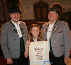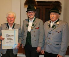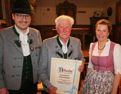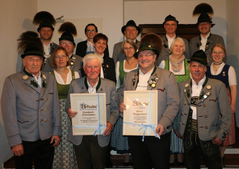Seit 70 Jahren ist Leonhard Obermaier, der Westner-Hartl von Stetten, Mitglied bei den Wildenwarter Trachtlern. „Für dieses Ereignis haben wir gar kein Ehrenzeichen mehr vorgesehen, also haben wir für den Hartl extra eine Urkunde entworfen“ so Helmut Freund. „Viel Erfahrung sammelte sich in den letzten Jahrzehnten für die Trachtensache und den Wildenwarter Trachtenverein an“, so der Vorsitzende des Wildenwarter Trachtenvereins beim Vereinshoagascht im gut besuchten Saal der Schlosswirtschaft. „viele junge Buam und Dirndl traten damals mit 15, 16 Jahren in den Verein ein und heute darf ich 18 von ihnen das Ehrenzeichen für ihre langjährige Vereinstreue übergeben“. Marianne Kronast, Peter Möderl und Johann Steindlmüller erhielten das goldene Ehrenzeichen des Vereins für 60 Jahre aktive Mitarbeit im Wildenwarter Traditionsverein, Josef Riepertinger bekam das Ehrenzeichen 50 für ein halbes Jahrhundert.
