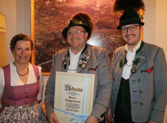 Peter Voggenauer, langjähriger Vorsitzender des Trachtenvereins „Die lustigen Wildenwarter“ erhielt beim Vereinshoagascht im Saal der Schlosswirtschaft die Ehrenmitgliedschaft des Vereins. Die Wildenwarter Trachtler gehen mit dieser höchsten Ehrung des Vereins sehr sparsam um, entsprechend hoch sei ihr Stellenwert anzusetzen, so der Vorsitzende Helmut Freund. Zusammen mit seinen beiden Stellvertretern Florian Stoib und Sabine Till übereichte er ihm das Ehrenzeichen und die Urkunde des Vereins. Da hinter jedem erfolgreichen Mann eine kluge Frau steht, bedankten sich die drei Vorstände mit einem Blumenstrauß bei Elfriede Voggenauer für die jahrzehntelange Unterstützung. „Mir hat es immer Spaß gemacht, egal welche Stelle in der Vorstandschaft ich in diesen 38 Jahren bekleidet habe. Besonders eindrucksvoll war die Arbeit als Jugendleiter mit den Buben und Mädchen des Vereins. Sie stellen heute als Aktive und junge Erwachsene das Rückgrat des Vereins dar. Dabei habe ich immer für das Dorf und im Sinne des Ganzen gehandelt“.