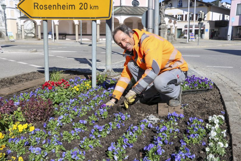 Rund um die Uhr waren Gerhard Schmidbauer, Leiter der Gärtnerei, und sein Team bei ihrem Einsatz im Winterdienst damit beschäftigt die Straßen und Gehwege von Schnee und Eis zu befreien. Jetzt hält der Frühjahrsflor Einzug in der Marktgemeinde Prien und die acht Mitarbeiter der PriMa sorgen mit zahllosen Pflanzen für ein farbenprächtiges Ortsbild. Neben den Verschönerungsmaßnahmen auf den Verkehrsinseln erfreuen die Grünflächen an Kreuzungen, in vielen Blumenbeeten und fast hundert Pflanzschalen im Ort und an den Schären die vorbeikommenden Autofahrer und Fußgänger. Hans-Dieter Hohndorf ist für das Anlegen und die Pflege der Beete verantwortlich. Seit bereits siebzehn Jahren bei der PriMa als Gärtner beschäftigt, hat er wohl schon das ein oder andere Pflänzchen in den Händen gehalten. Derzeit ist er damit beschäftigt über 5.000 Frühblüher zu setzen. „Das Stiefmütterchen ist ein beliebter Klassiker unter den Frühlingsboten“, erklärt Hohndorf. „Sie gehören mit zu den ersten Blumen, die den Frühling ankündigen und zudem auch noch bis in den Sommer hinein mit einer unglaublichen Farbpallette von Weiß über Gelb, Rot, Blau bis hin zu Violett und Schwarz überzeugen.“ Allein 4.000 Stück dieser wohl bekanntesten Veilchenart (Viola x wittrockiana) verschönern künftig mit ihren farbenprächtigen und großflächigen Blüten das Ortsbild. „Anfang April wird die Frühjahrsbepflanzung abgeschlossen sein. Sie ist nur ein kleiner Teil unseres weit gefächerten Aufgabengebiets“, sagt Gerhard Schmidbauer, Leiter der Gärtnerei.