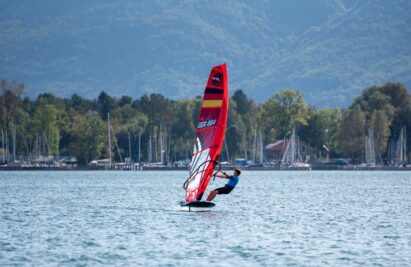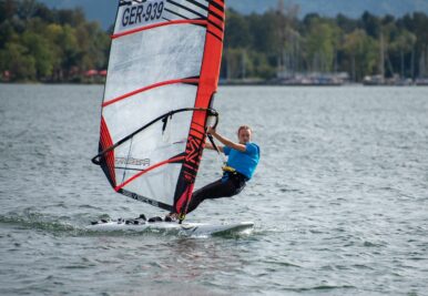 Traumkulisse bei der Jubiläumsregatta: beim 40. Chiemsee-Inselmarathon gab es am ersten Wettfahrttag wolkenlosen Himmel und gut 3 Beaufort Wind. 64 Surfer aus sechs Ländern hatten sich eingefunden, um die Langstrecke mit der Umrundung aller drei Chiemseeinseln in Angriff zu nehmen. In der offenen Klasse mit unbegrenzter Segelfläche konnte jeder entscheiden, ob er mit dem Raceboard, dem Verdrängerbrett oder dem olympischen Foilboard aufs Wasser ging. Insbesondere das Foilboard mit der fast 1 Meter langen Finne und den breiten Foilauslegern an der Finne kommt bei gutem Wind knapp einen halben Meter aus dem Wasser und ist aufgrund des geringen Wasserwiderstands extrem schnell. Bei weniger Wind sind allerdings die Raceboardsurfer im Vorteil.