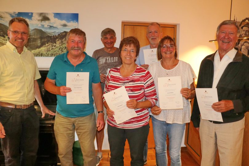Die Kolping Familie in Aschau besteht seit dem Jahr 1981 – also seit über 40 Jahren. Da im vergangenen Jahr keine Veranstaltungen stattfinden konnten, würdigte der Vorsitzende der Aschauer Kolpingsfamilie Johann Berghammer das Jubiläum bei der Jahreshauptversammlung des Vereins im Aschauer Pfarrheim. Auf Veranlassung von Pfarrer Hans Holzner fanden sich 1981 in der Aschauer Pfarrgemeinde Männer und Frauen zusammen, um die Ideen Adolf Kolpings auch im Oberen Priental mit Leben zu füllen. Zum Vorsitzenden der Gemeinschaft wählte die Versammlung damals Johann Berghammer; so konnte der Kolpingvorsitzende im Vorjahr zusammen mit der Gemeinschaft und elf Gründungsmitgliedern sein 40-jähriges Jubiläum im Dienst von Adolf Kolping begehen. Fünf von ihnen nahmen die Ehrenurkunde und die silberne Kolpingnadel aus der Hand des Vorsitzenden und des geistlichen Beirats Pfarrer Paul Janßen entgegen: Hans Aicher, Josef Baur, Christine Noichl, Uschi Pellkofer und Michael Stuffer. Ilse Goßner bedankte sich bei Johann Berghammer für seine umsichtige Vereinsführung, der Vorsitzende sei der Motor der Kolpingbewegung in Aschau, er wirke neben seiner Tätigkeit als Vorsitzender auch an anderen Stellen im Verein mit, sei es als Fähnrich, als Schriftführer oder als Nikolaus oder als Organisator der Kleidersammlungen. Zusammen mit Pfarrer Paul Janßen überreichte sie dem rührigen Vorsitzenden einen kleinen Präsentkorb.