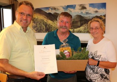 Ilse Goßner (rechts) bedankte sich beim Vorsitzenden der Kolpingfamilie Aschau Johann Berghammer (Mitte) für seine umsichtige Vereinsführung seit 40 Jahren, der Vorsitzende sei der Motor der Kolpingbewegung in Aschau, er wirke neben seiner Tätigkeit als Vorsitzender auch an anderen Stellen im Verein mit, sei es als Fähnrich, als Schriftführer oder als Nikolaus oder als Organisator der Kleidersammlungen. Zusammen mit Pfarrer Paul Janßen (rechts) überreichte sie dem rührigen Vorsitzenden einen kleinen Präsentkorb.