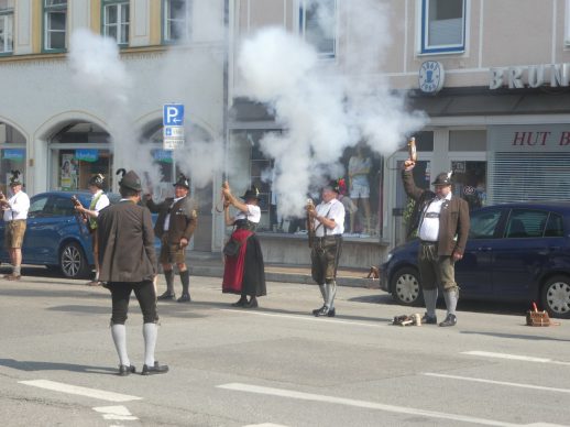 400 Jahre alt, aber erfrischend aktiv ist in Prien die Königlich Privilegierte Feuerschützengesellschaft 1617. Die FSG Prien nahm das große Jubiläum zum Anlass, richtig zu feiern und die Bevölkerung mit einzubeziehen. So konnten nach einem Kirchenzug vom König-Ludwig-Saal zum Marktplatz von Festleiter Sepp Furtner und Erstem Schützenmeister Florian Wunderle zahlreiche Ehrengäste und Mitglieder von Schützen- und Ortsvereinen begrüßt werden. Unter den Ehrengästen waren als Schirmherr Seine Königliche Hoheit Herzog Max in Bayern und Bürgermeister Jürgen Seifert von der Gemeinde Prien. Den Gottesdienst zelebrierte Pater Joshy. Er sagte am Festtag des Heiligen Johannes des Täufers in seiner Predigt: “Johannes lebte für seine Aufgabe als Wegbereiter Gottes und die Schützengemeinschaft lebt seit 400 Jahren für die Heimat, anfangs noch als Selbstschutz der Bevölkerung und zur Landesverteidigung. Florian Wunderle machte bei der Kranzniederlegung am Kriegerdenkmal bewusst, dass der seit über 75 Jahren herrschende Frieden in Deutschland ein wahrhaft hohes Gut ist und dass jeder Einzelne aufgefordert ist, seinen Einsatz für den Friedenserhalt zu geben. Der Gottesdienst und das Gedenken am Priener Marktplatz boten ein eindrucksvolles Bild mit dem schön hergerichteten Altar sowie mit den zu einem Halbkreis versammelten 30 Fahnenabordnungen. Mit Festkutschen für die Ehrengäste sowie mit den Blaskapellen Prien und Wildenwart führte in zwei Zügen der Festzug vom Marktplatz zum Rathaus und von dort in einem Gegenzug zurück zum König-Ludwig-Saal. Dort wurde das FSG-Jubiläum mit einem Festmahl, mit Festansprachen und mit einem Fest-Programm gefeiert.