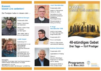 Die Gebetsreihe wird fortgesetzt mit Predigten am Samstag um 14.30 Uhr (nach Rosenkranz um 14 Uhr) von Pastoralreferentin Judith Seipel zum Thema “Mit Herz, Kopf, Hand und Fuß: das Gebet des Lebens – Alle Handlungen derjenigen, die gottesfürchtig leben, sind fortgesetzte Gebete – das nennt man das Gebet des Lebens (Franz von Sales)” sowie am Sonntag, 5. März um 10 Uhr beim Pfarrgottesdienst mit Pfarradministrator Gottfried Grengel (“Anbetung ist Liebe in ihrer höchsten Form”). Die 5. Predigt zur Feierelichen Abschlussandacht um 14.30 Uhr (nach Rosenkranz um 14 Uhr) hält Pfarrer Josef Steindlmüller zum Thema “Sonntag – Tag der Anbetung”.