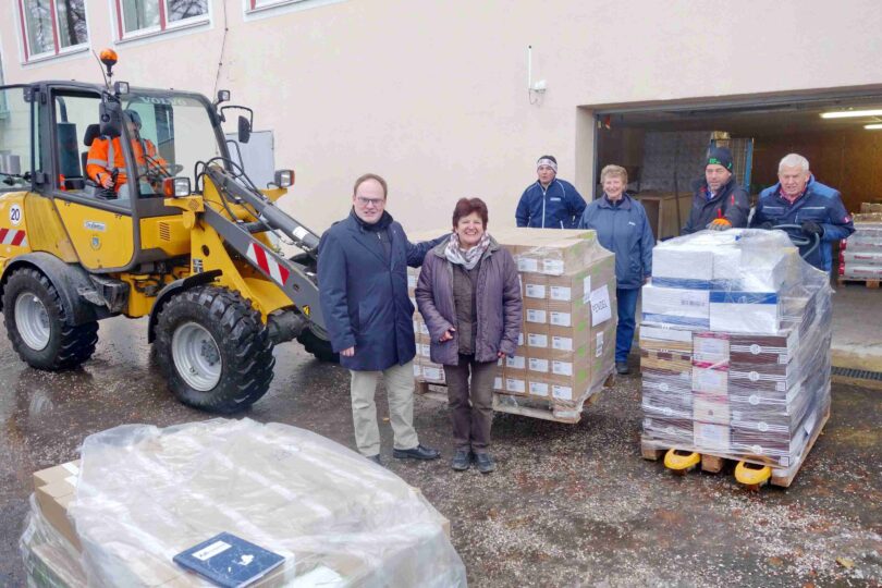 Priens Bürgermeister Andreas Friedrich machte sich selbst ein Bild von der großen Verladeaktion beim König-Ludwig-Saal. Dessen Keller konnte eine Woche zuvor bei der umfangreichen Spendenaktion für die Zwischenlagerung genutzt werden, da die dort sonst befindlichen Hütten des Priener Christkindlmarktes derzeit außer Haus sind. „Da der bisher bei der Priener Feuerwehr genutzte Raum für die Sammlung von Spenden im Winter von der Feuerwehr selbst gebraucht wird, haben wir mit der Keller-Lösung vom König-Ludwig-Saal Glück gehabt“ – so der Bürgermeister, der versprach, den Chiemgauer Helferkreis zusammen mit der Prien Marketing GmbH auch fortan bei dessen vielen Aktionen zu unterstützen wo immer es möglich ist. Für die Helferkreis-Vorsitzende Katharina Schmid war die dreitägige Sammel- und Verlade-Aktion ein großer Erfolg, zur Finanzierung der Doppel-LKW-Fahrten sagte sie: „Es ist uns wieder gelungen, zwei LKW, die aus der Ukraine nach Deutschland lieferten, für die Mitnahme unserer Güter zu gewinnen, damit sparen wir uns die Hälfte der Transportkosten. Diese belaufen sich bei einer Fahrtrichtung auf rund 2.500 Euro je LKW. Das Geld stammt von den Spenden, die wir von vielen Seiten und besonders von BR Sternstunden bekommen haben. Sternstunden allein stellte uns für die Versorgung von Kindern und ihrer Mütter einen Betrag von 140.000 Euro zur Verfügung“. Für die aktuellen 16. und 17. LKW-Transporte hat der Helferkreis für ca. 50.000 Euro Waren und Lebensmittel gekauft. Zusammen mit den gespendeten Sachen wurden beide LKW bis unter das Dach voll beladen. Damit Verladen und Papiere für den Zoll auch diesmal klappten, stellten sich wieder Ehrenamtliche des Vereins zur Verfügung. „Ohne Traudi Steiner, die für den Zoll genaueste Angaben zu Anzahl von Palletten und Schachteln erfasst und ohne ihren Mann Jakob wäre die Aktion nicht zu starten. Die beiden sollen beispielhaft und stellvertretend genannt werden für alle Mitglieder und Ehrenamtliche, die Hand anlegen, um das Leid bei unseren Freunden in der Ukraine lindern zu helfen“.