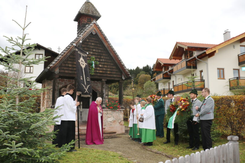 Mit den Fahnenabordnungen und der Wildenwarter Blaskapelle zogen die beiden Trachtenvereine aus der ehemaligen Wildenwarter Gemeinde nach dem Gottesdienst zum Kriegerdenkmal in Prutdorf und hielten dort die Gedenkfeier für die Verstorbenen, Gefallenen und Vermissten der Vereine. Das Libera an der Gedächtniskapelle in Prutdorf betete Pfarrer Zehetmair.