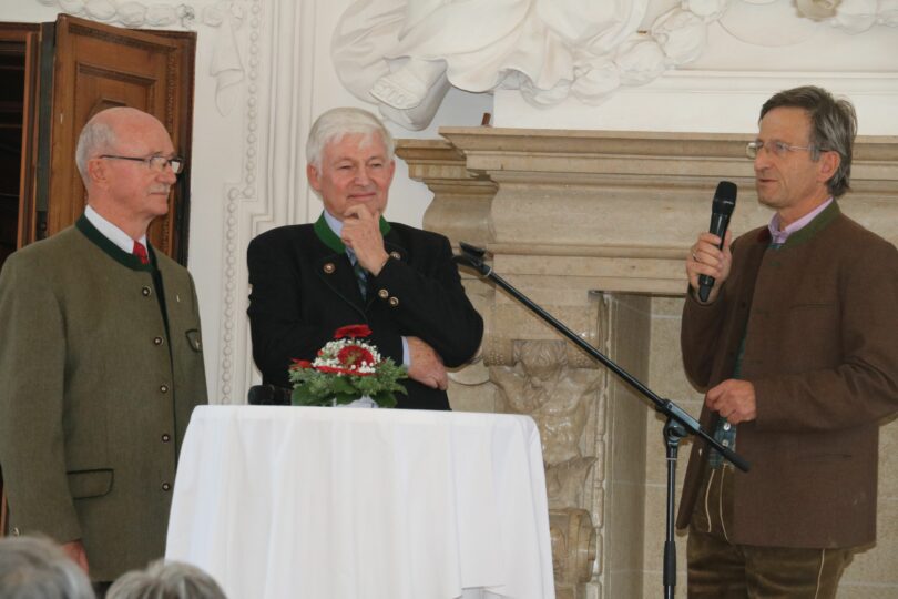 “40 Jahre sind eigentlich kein rundes Jubiläum, das traditionell gefeiert wird“, eröffnete die Vorsitzende des Heimat- und Geschichtsvereins Aschau (HGV) Dr. Natascha Mehler die Feier zum 40-jährigen Gründungsjubiläum des Vereins im Preysingsaal auf Schloss Hohenaschau. „Im Vergleich zu den Trachten- und Schützenvereinen sowie der Feuerwehr, die alle weit über 100 Jahre alt sind, sind wir mit 40 ja noch ein ganz junger Verein. Anlass für diese Feier ist vor allem, dass der Vereinsgründer Wolfgang Bude heute mit der Ehrenbürgerwürde der Gemeinde Aschau ausgezeichnet wurde“. Drei der bisherigen Vorsitzenden Hans Rucker, Dr. Ulrich Feldmann und Dr. Natascha Mehler kamen zur Jubiläumsveranstaltung, der Gründungsvorsitzende Dr. Hans Stocker ist bereits verstorben. Drei Gründungsmitglieder waren noch anwesend, dazu zahlreiche weitere mit langjähriger Mitgliedschaft. Etwa 150 der knapp 500 Mitglieder nutzten die Möglichkeit, wieder einmal das Schloss besuchen und bei der Feierstunde den barocken Preysingsaal bewundern zu können.