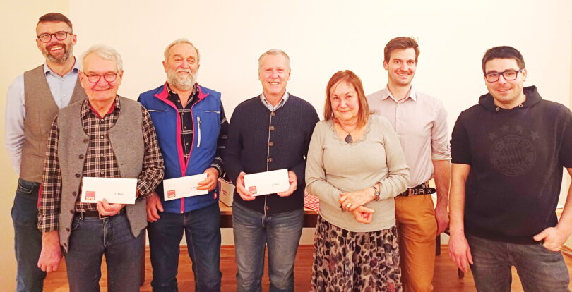 Bericht Christiane Giesen – Unser Foto zeigt (von links) Richard Prasser, Jakob Huber und Rudi Jantke. Alle Geehrten von links. Bürgermeister Stefan Kattari, Richard Prasser, Jakob Huber, Rudi Jantke, Christiane Giesen, Veit Heigenhauser und Martin Steiner. Foto: Tobias Gasteiger