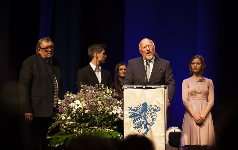 Bildunterschrift: Bayerische Einigung – Prof. Dr. Manfred Treml am 1.12.2014 inmitten von Schülerinnen und Schülern aus dem Ludwig-Thoma-Gymnasium in Prien am Chiemsee anlässlich der Verleihung des Verfassungspreises “Jugend für Bayern” 2014 (Vergeben von Bayerischer Volksstiftung und Bayerischer Staatregierung) an dieses Gymnasium.