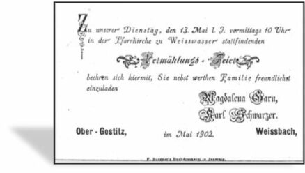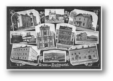 Fotos/Repros: 1. Erinnerungen an Hochzeiten der Vorfahren von Gerold Schwarzer – 2, Karte mit Hinweis auf die Heimatorte – 3. Postkarten historisch von Zuckmantel – 4. Buch-Titel.