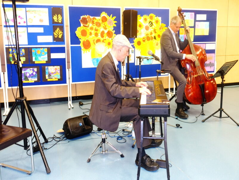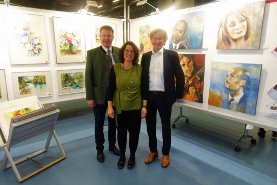 Insgesamt rund 50 Einzel-Aussteller, davon 15 aus der Gemeinde Rimsting und die weiteren von anderen Chiemgau-Gemeinden zeigen bei der mit Hilfe des gemeindlichen Bauhofs aufgebauten Ausstellung ihre Werke. „Besonders freut mich, dass auch heuer wieder die Kinder sehr aktiv waren, wir sehen Werke von den Kindergärten in Rimsting und in Greimharting, vom Haus für Schulkinder-Hort und von der Grundschule Rimsting“ – so Erster Bürgermeister Andreas Fenzl bei der Begrüßung bei der stark besuchten Vernissage. Sein besonderer Dank galt dem Kultur- und Kunstkreis Rimsting mit Johanna Arends und Sebastian Grießl und deren Helferinnen und Helfern sowie Gabi Oberloher von der Tourist-Information Rimsting für die umfassenden Vorbereitungen. Begeistert zeigte sich Sebastian Grießl über das Zusammenwirken mit der Gemeinde Rimsting und mit den Künstlern und sagte: „Die Gemeinde ist erneut ein Aushängeschild, weil sie die sehr geeignete Sporthalle für acht Tage nicht nur den Rimstingern, sondern darüberhinaus den Künstlern und Kunstinteressierten zur Verfügung stellt“. Bei seinen Einführungen ergänzte er, dass Kunst in einer Zeit vieler Unsicherheiten in der Welt von unbezahlbarem Wert ist und dass die Neujahrsausstellung wieder ein Ort des Durchatmens sowie der Freude für Auge und Seele ist. Alsdann wurde die Ausstellung im Beisein von Altbürgermeister Florian Hoffmann, der Bürgermeister-Stellvertreter Thomas Schuster und Robert Perl sowie weiterer Ehrengäste eröffnet und die Besucher konnten auch Unikate von Malerei, Skulpturen, Fotografie und Kunsthandwerk bei persönlichem Austausch mit den Kunstschaffenden erwerben. Für die passende musikalische Gestaltung der Vernissage sorgte der Pianist und Sänger Michael Alf mit Hans Baltin junior (Kontrabass) mit ihren Jazz-, Blues- und Boogie-Woogie-Weisen. Die Kultur- und Kunstkreis-Mitglieder übernahmen eine kleine Bewirtung. Über Prämierung anlässlich eines Foto-Wettbewerbs berichten wir noch gesondert.