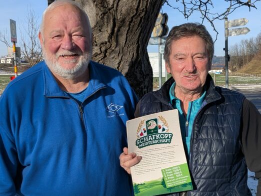 Foto: Die Spielleiter Anton Feistl (li.) und Hans Winkler mit dem Spielprogramm zu den Auerbräu-Schafkopfmeisterschaften 2026