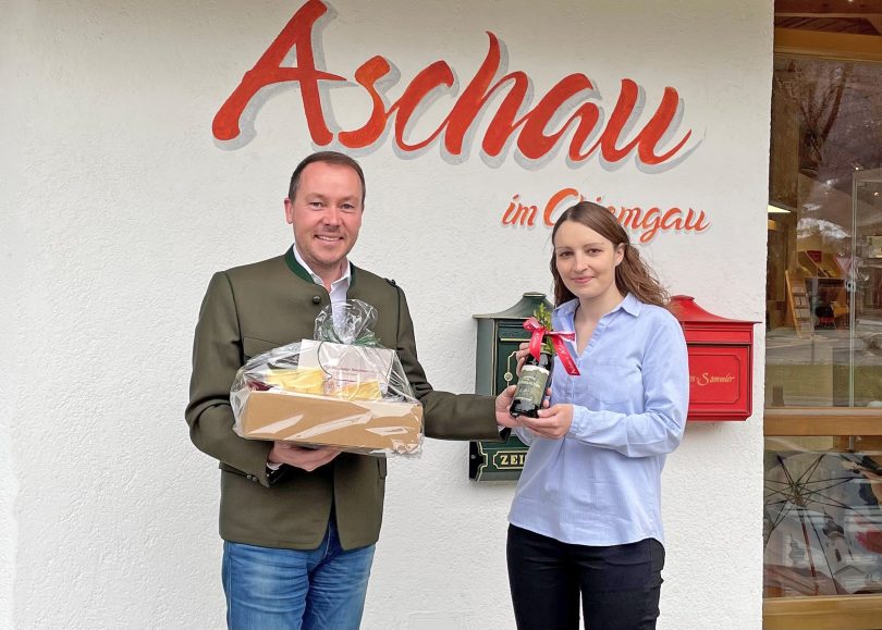 Die Betreuerin des Projektes, Frau Julia Körner (rechts) vom Bayerischen Landesanstalt für Weinbau und Gartenbau, schaute nun bei Aschaus Tourismuschef Herbert Reiter (links) vorbei und berichtete über den aktuellen Stand der Aktion und geplante Weiterentwicklungen. In diesem Zusammenhang wurde auch gleich die Neuauflage eines Genussführers für Aschau i.Chiemgau und Sachrang besprochen. Für Fragen und Anliegen steht Julia Körner als kompetente Ansprechpartnerin für die ausgezeichneten Genussorte von Bayern zur Verfügung. Herbert Reiter überreichte eine Genuss-Schmankerl-Kiste mit regionalen Produkten aus dem Priental und dabei durfte natürlich das neue Gamsbier aus dem Hohenaschauer Brauhaus nicht fehlen. „Halten doch Essen und Trinken Leib und Seele zusammen“, wie das Sprichwort sagt und, um den Beweis anzutreten, dass Aschau das Prädikat verdient.