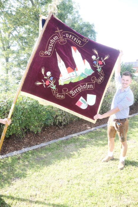 Der Geistliche sagte eingangs: “In dieser Feierstunde sind wir eingeladen zum Fest des Glaubens, denn so eine Gottesdienstfeier ist mehr als Traditionspflege, zur inneren Überzeugung des eigenen Glaubens und um Rückschau zu halten auf die Gründer des Vereins und Dankbarkeit sein über alles, was in diesen fünf Jahrzehnten in dieser Gemeinschaft so entstanden ist”. Eder erläuterte drei Gedanken an die Jugend: “Gerechtigkeit üben, Enddecken/Hinterfragen sowie die Gemeinschaft pflegen und stärken”. Auf Eurer Vereinsfahne steht „Freundschaft der Jugend – Freunde für’s Leben”. Relativ einfach lässt sich erklären, was es bedeutet, ein waschechter „Berghofener Bursch“ zu sein: „Freundschaften zu knüpfen, egal ob jung oder alt, miteinander zu arbeiten und zu feiern, und zwar nicht nur im Vereinsleben“. Die Rückseite der Fahne ist mit der Berghofener Kirche bestickt. Das Frühjahr 1974 gilt als die Geburtsstunde von etwas ganz Großem. Die acht Junggesellen Johann Kastl, Georg Kastl, Franz Neumeier, Lorenz Augustin, Thomas Haslbeck, Josef Linner, Matthias Radlmeier und Johann Schweiger haben den Verein, im Rahmen des traditionellen Stammtisches in Berghofen, Gemeinde Eching gegründet. Zum Gründungsvorstand wurde Josef Linner gewählt. Schnell entwickelte sich ein aktives Vereinsleben in bunter und vielfältiger Weise. Es wurden Fahnenweihen, Gründungsfeste, Sonnwendfeier, Dorffeste besucht, Burschenausflüge unternommen und Fußballfreundschaftsspiele gegen Gemeindevereine ausgetragen. Diese Spiele trugen auch dazu bei, den Zusammenhalt zwischen den Generationen zu fördern. Zehn Jahre darauf konnten die Berghofener Burschen erstmals eine Fahne ihr Eigen nennen. In der Zeit vom 8. bis 10. Juni (Pfingstsonntag) 1984 wurde das zehnjährige Gründungsfest mit Weihe der neuen Vereinsfahne gefeiert. Als Fahnenmutter wurde die Christa Mayer mit ihren zwanzig Festdamen auserkoren. Bereits damals wussten sie, wie man richtig feiert. Gemeinsam mit dem Patenverein “Glück-Auf Burschenverein Attenhausen” sorgten die Berghofener Burschen bei der Fahnenweihe für ausgelassene Stimmung. Die Fahne soll eine bleibende Erinnerung an diese Festtage sein und dem Verein in Zukunft als Symbol der Freundschaft dienen, gemäß des es Spruches auf der Fahne “Freundschaft der Jugend, Freunde für’s Leben”. Er soll den engen Zusammenhalt des Burschenvereins in der Vergangenheit und in der Zukunft zeigen. Im Mai 1999 wurde das 25-jährige Gründungsfest und in der Zeit vom 08. bis 10. Mai 2009 das 35-jährige Gründungsfest des Burschenvereins Berghofen mit der Bevölkerung und vielen Vereinen groß gefeiert. Als Festmutter konnten die Cornelia Bauer, Festbraut Maria Bauer, Ehrenfahnenmutter Christa Mayer mit den Begleitmädchen und Festdamen sowie als Patenverein der Burschenverein Attenhausen gewonnen werden. Das 50-jährige Bestehen des Burschenvereins Berghofen klang am Samstag mit einem gemeinsamen Essen und anschließendem geselligen Abend und guten Unterhaltung an den Tischen aus. Für die musikalische Umrahmung sorgte die Musikgruppe “Ladawix”.